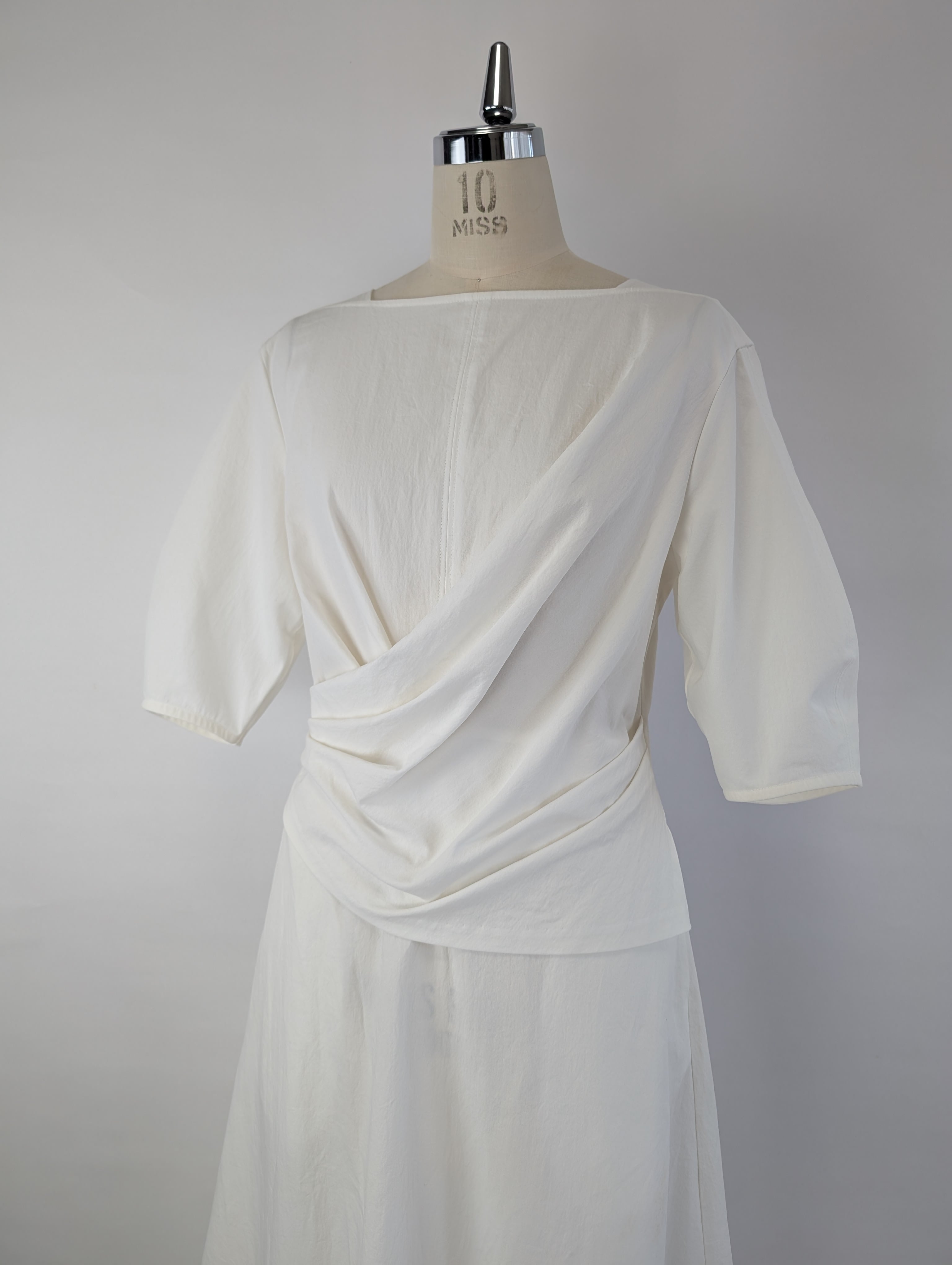 ・シンプルでありながらエレガントな印象を与えるボートネックデザイン、マチ付きの為、下着が見える心配はなく着用していただけます。