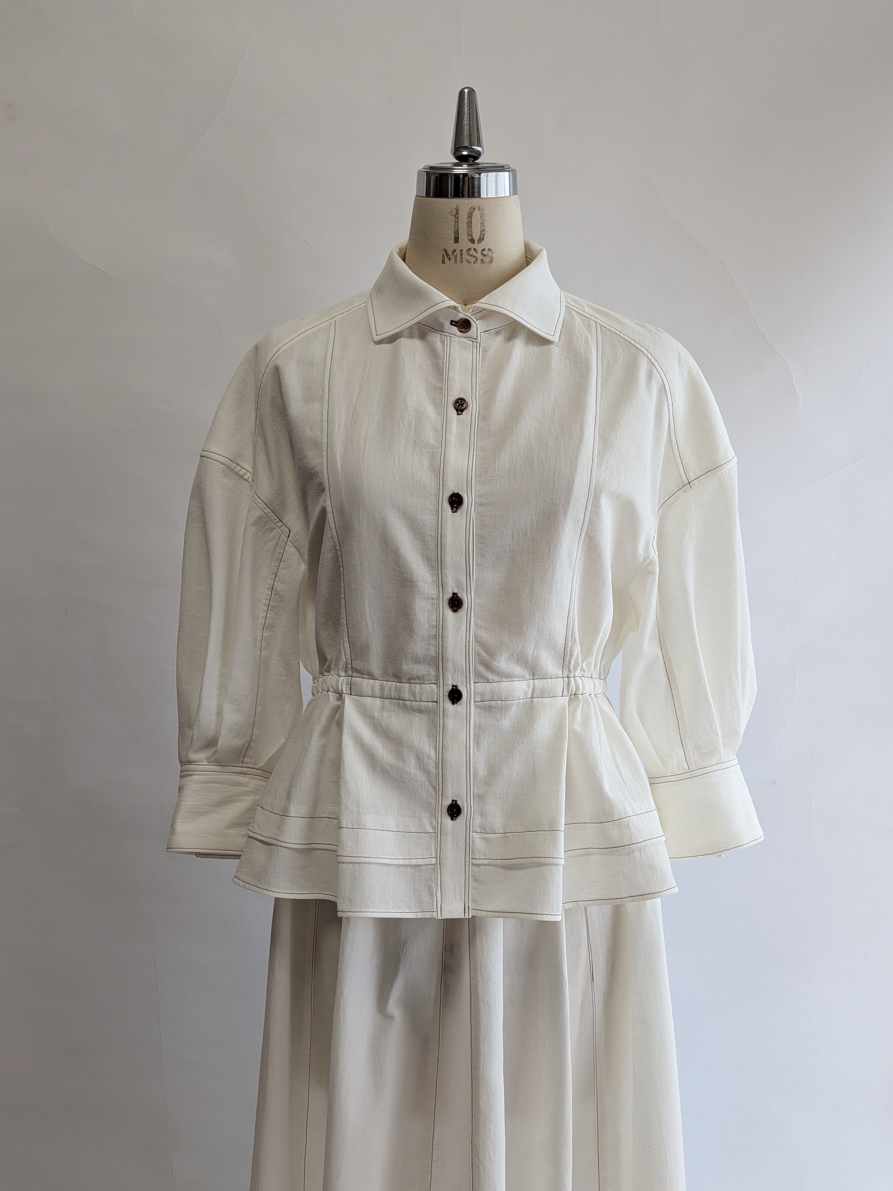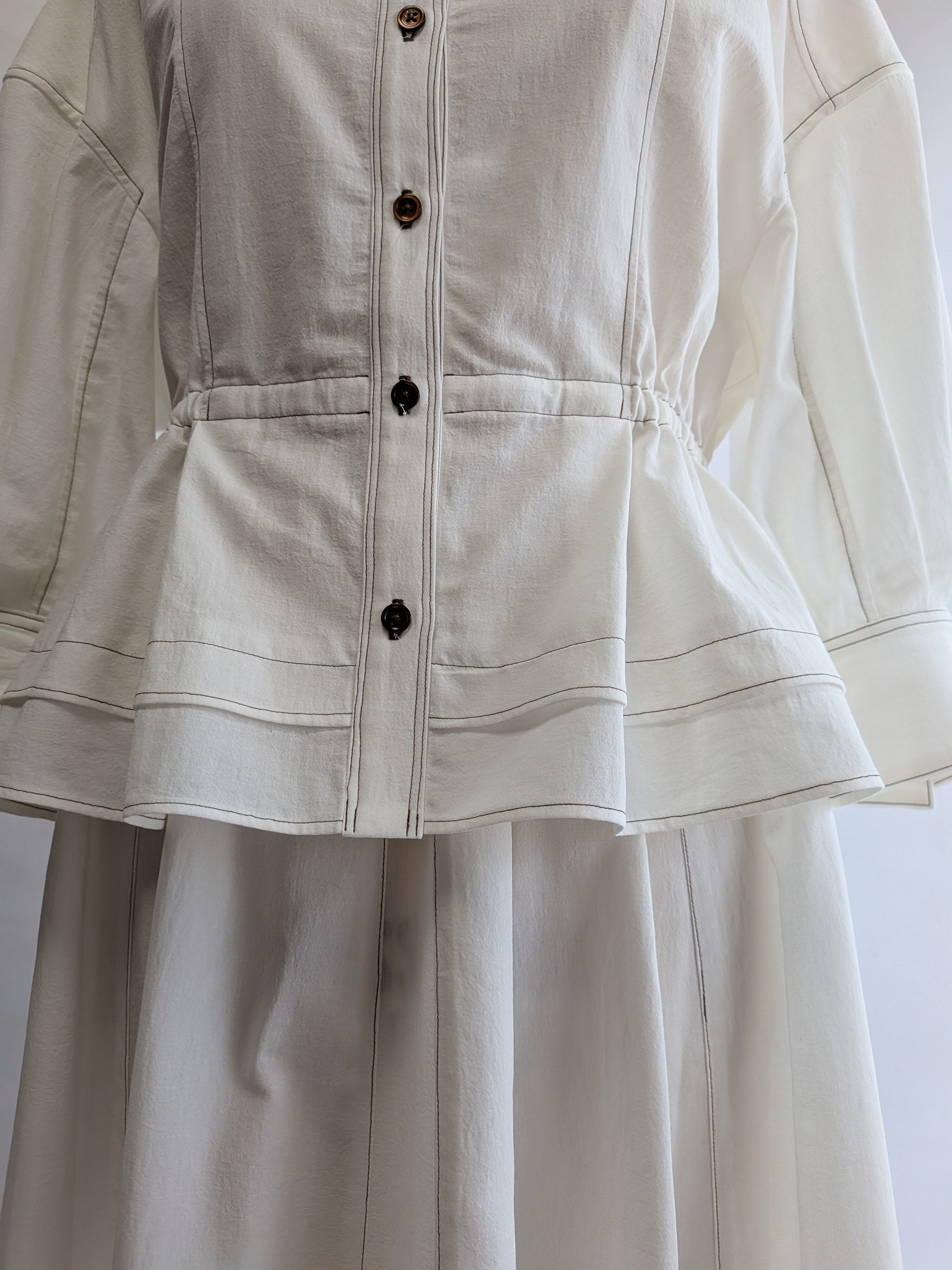 ・優しい印象のホリゾンタルカラーに、ペプラムが華やかな短めの丈のブラウスに、腰回りはすっきりとした切り替えマチのフレアースカートのセットアップです。
